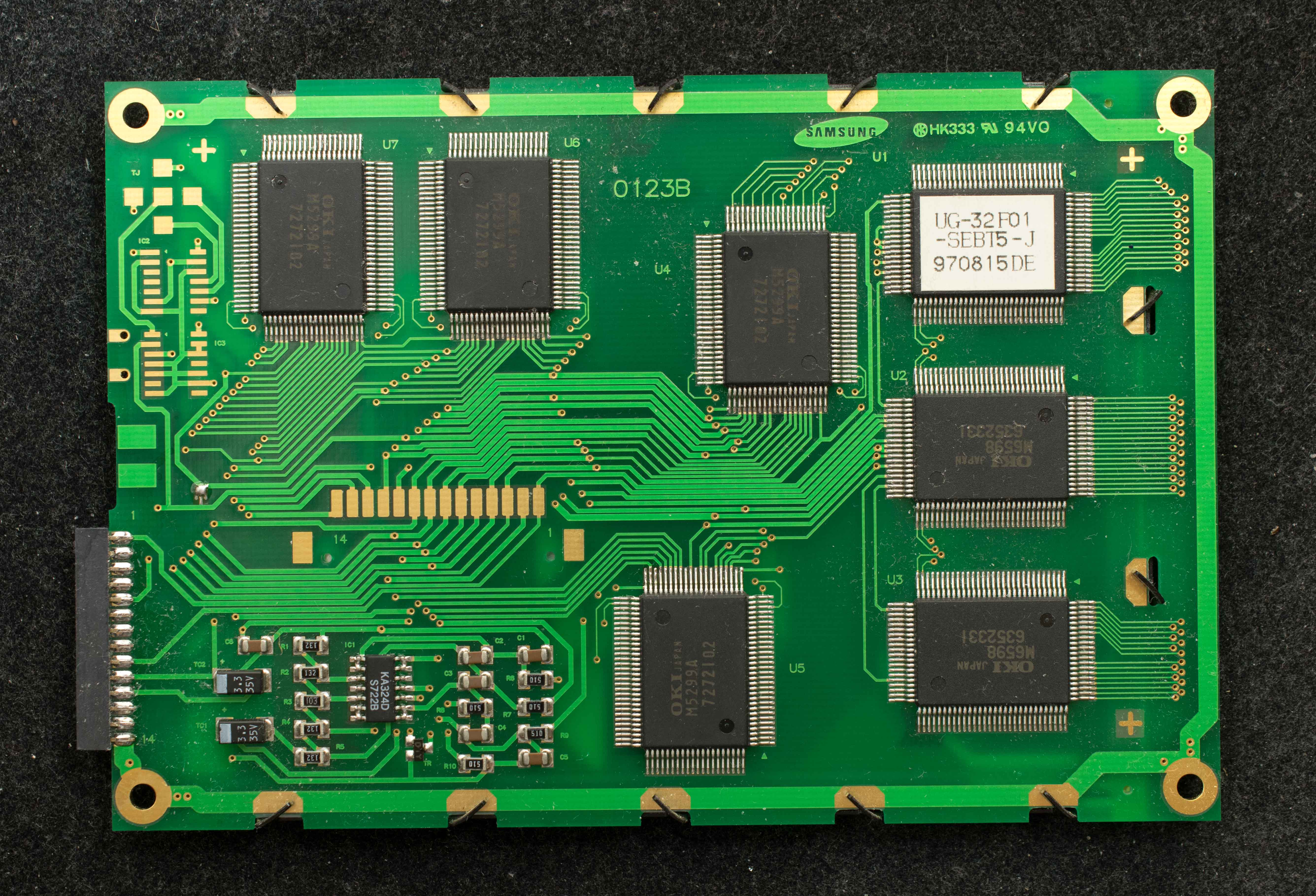 This is picture of the ICs at the back of UG-32F01. They are 4 MSM5299 80-dot segment drivers for 320 dots and 3 MSM6598 80-dot common drivers for 240 rows of 320 dots per row. My limited understanding is collectively they shift data to locations on the screen kinda like raster scan of CRT. It is unclear to me how long the LCD screen retains the data. The datasheet mentions a minimum frame frequency of 70Hz, implying the screen need to be refreshed 70 times a second, minimum? I did find a paper describing UG-32F01 in conjunction with SED1351 graphic controller. That is my best hope of reverse engineering the LCD display, a rather arduous process...