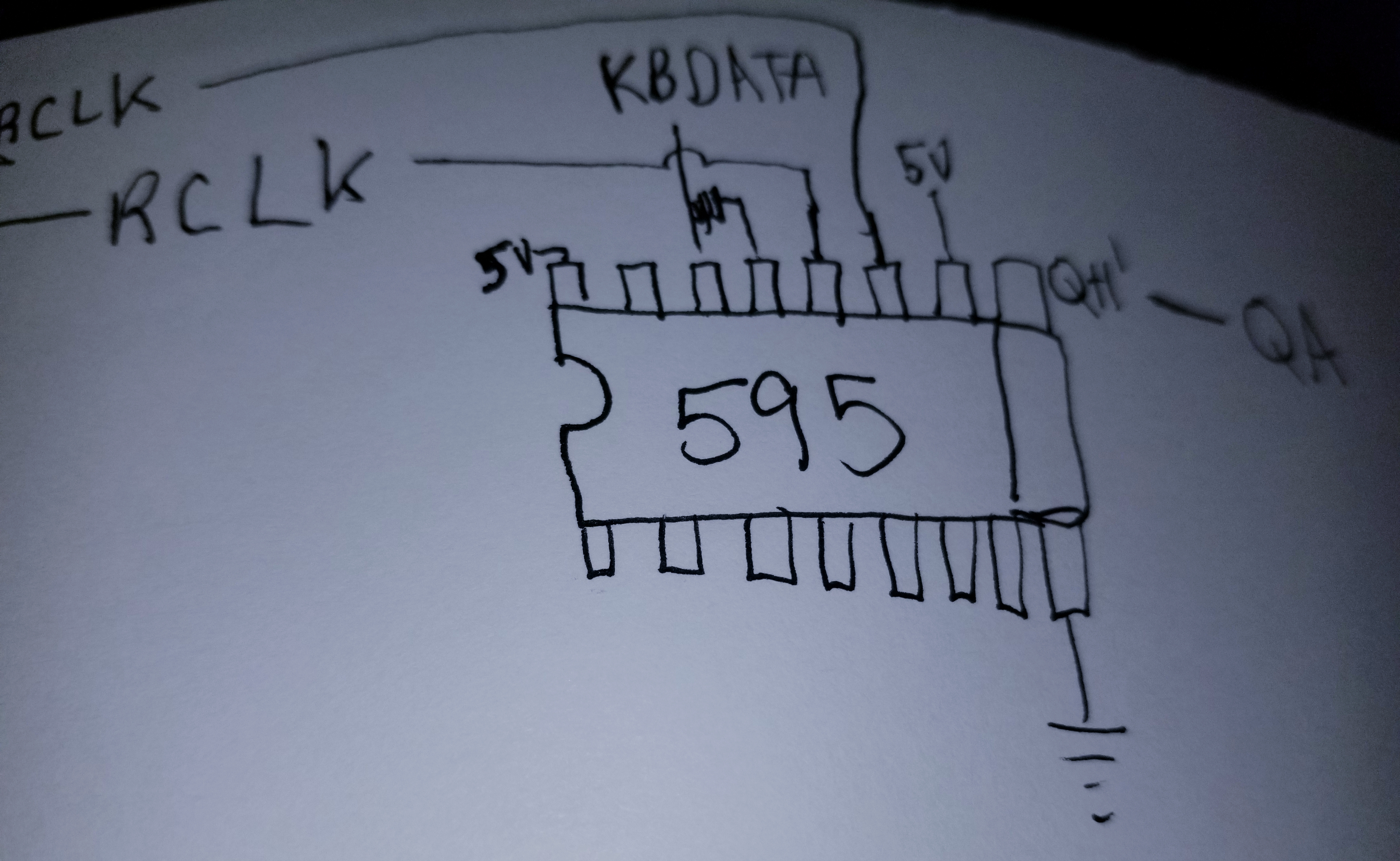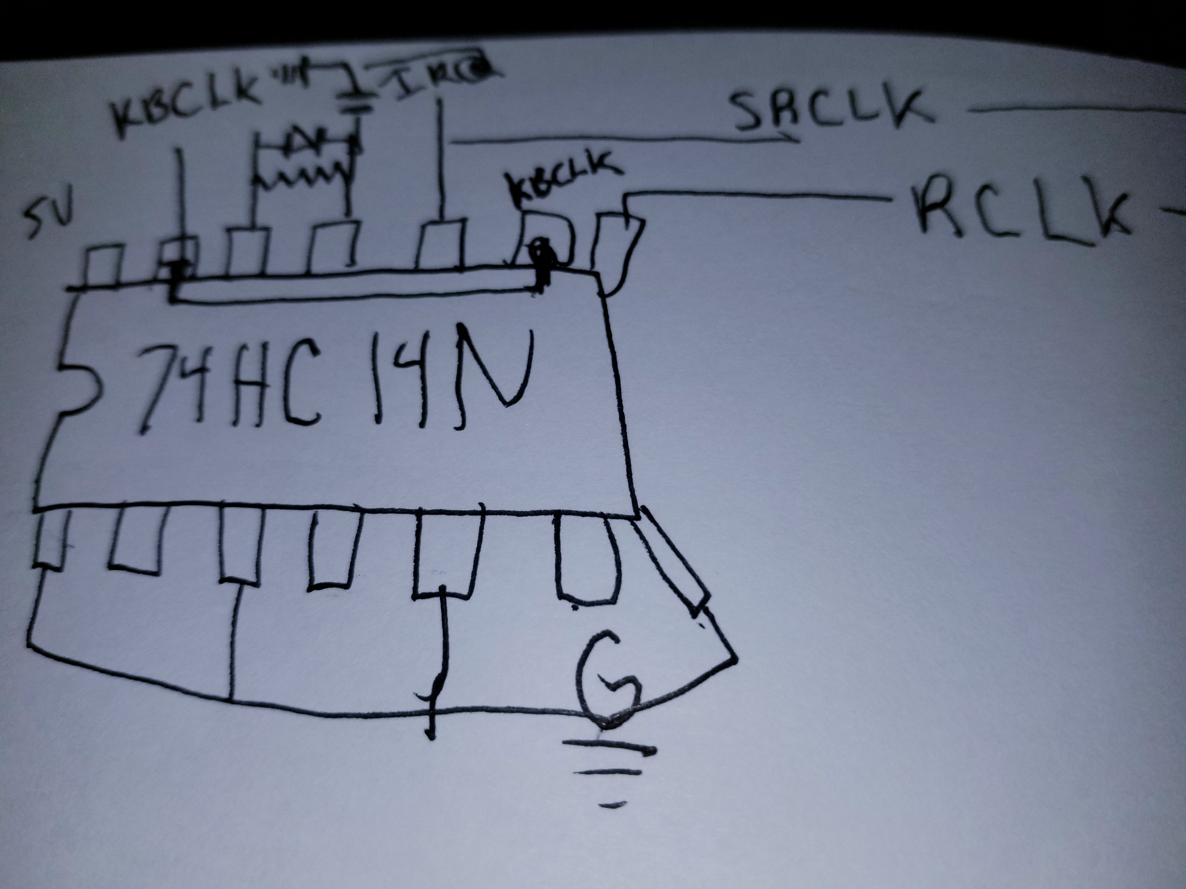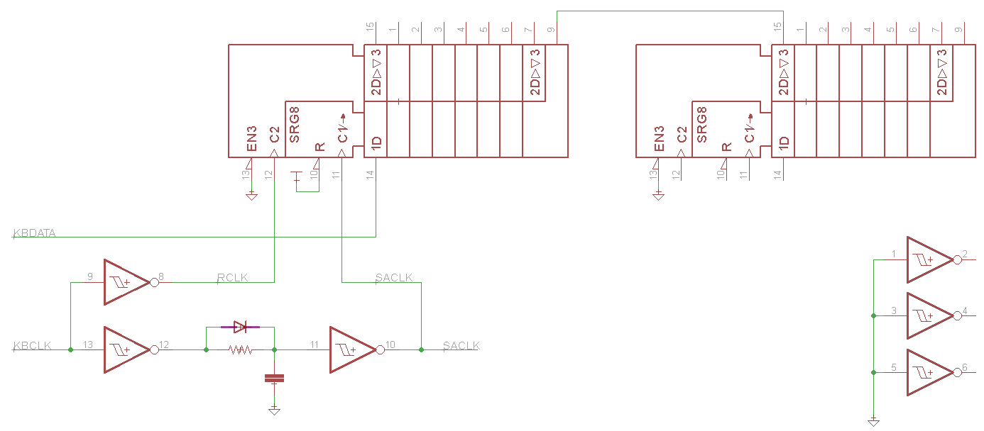 So I am using a 74HC14 and 2 74HC595's to take the KBCLK and KBDATA, shift in the 11 bits of the scancode, and then plan to just snag the 8 bits that represent the key and use that to output the key to the LCD (just a carbon copy of a hungry youtube fella). I tried to draw this three times and this is my best attempt, so have mercy. the SR and RCLKs are connected to the second '595 and the last bit rolls to the (edit: SER) of the second '595. And the OE of the 595 connected to ground is not connected to the KBDATA, I just suck at drawing. :lol: I have the cheapest logic probe known to man but the bleeps and bloops appear to be behaving themselves going from the '14 to the '595s but there is no output, or more specifically the outputs are all high. They don't twiddle dee or twiddle dum, just steady high.