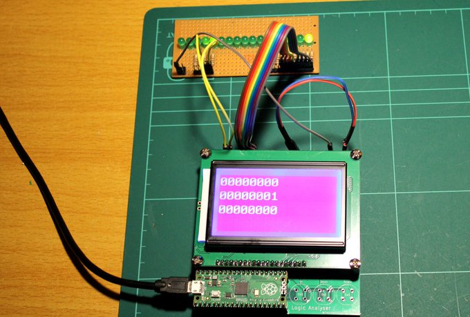 I have also made my own logic analyser, which I am monitoring the data and address bus with, and also acts as the clock to the 6502. Here's a pic of when I put it together after receiving the boards back from PCBWay after designing them. In the pic, I was just testing all of the I/O's to make sure it worked as planned, which it did!