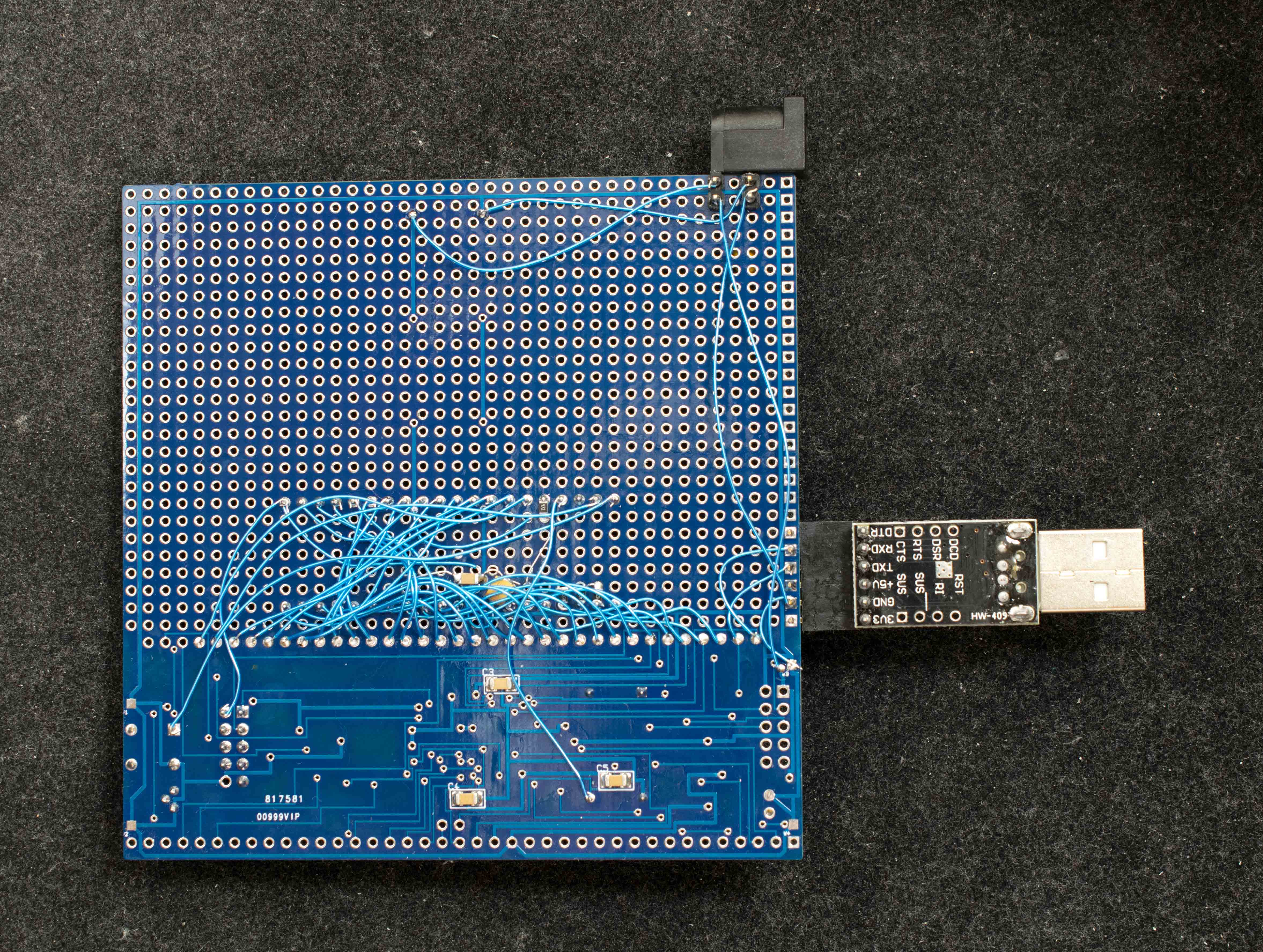 I'm done for the night. This is where I am tonight. The wiring is finished. I have powered it up without the 6502 and able to program the CPLD. I had a working serial port design that I successfully ported to this CPLD. I'm able to get the serial transmitter to spit out data continuously by periodically jamming a byte into the serial transmit buffer. Tomorrow I'll write a 6502 ROM program for the CPLD and try to boot up a real 6502.