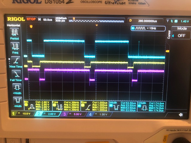 purple is CA2 (which my interrupt handler sets lo and high manually by writing to the VIA's PCR)