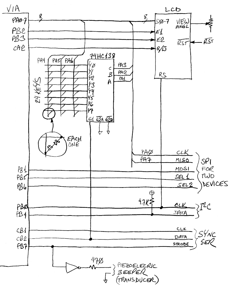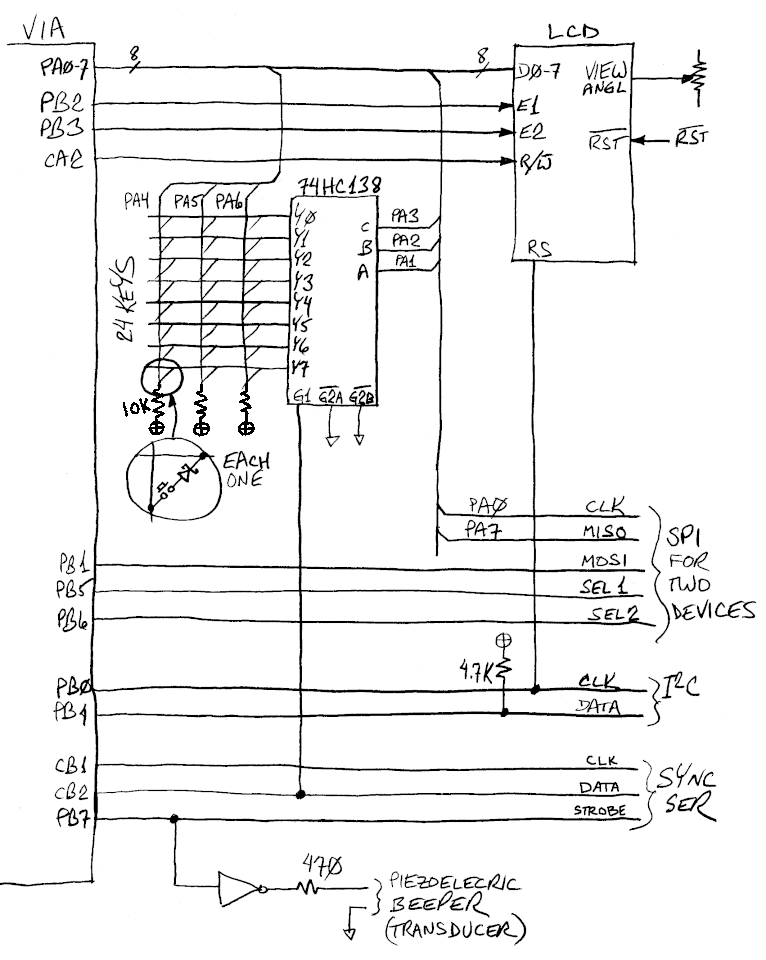 The VIA's own hardware synchronous serial port, or "SR" for "shift register," is useful for interfacing to chains of I/O bits on ICs like 74HC595's, 74HC165's, 4094's, and 4021's. CB2, the data line, also enables the '138 when you want to scan the keypad. It should seldom if ever be a problem that you can't keep the SR port going while scanning the keypad. The beeper is one of those .015"-thick ones like you find in greeting cards. It's like a tiny brass speaker, using AC to drive it, not DC, so PB7, outputting a square wave, either under software control or toggling PB7 each time T1 in free-run mode times out, determines the beep frequency. I put the inverter and 470Ω resistor in there as a buffer, so the piezoelectric element's capacitive load doesn't cause problems.