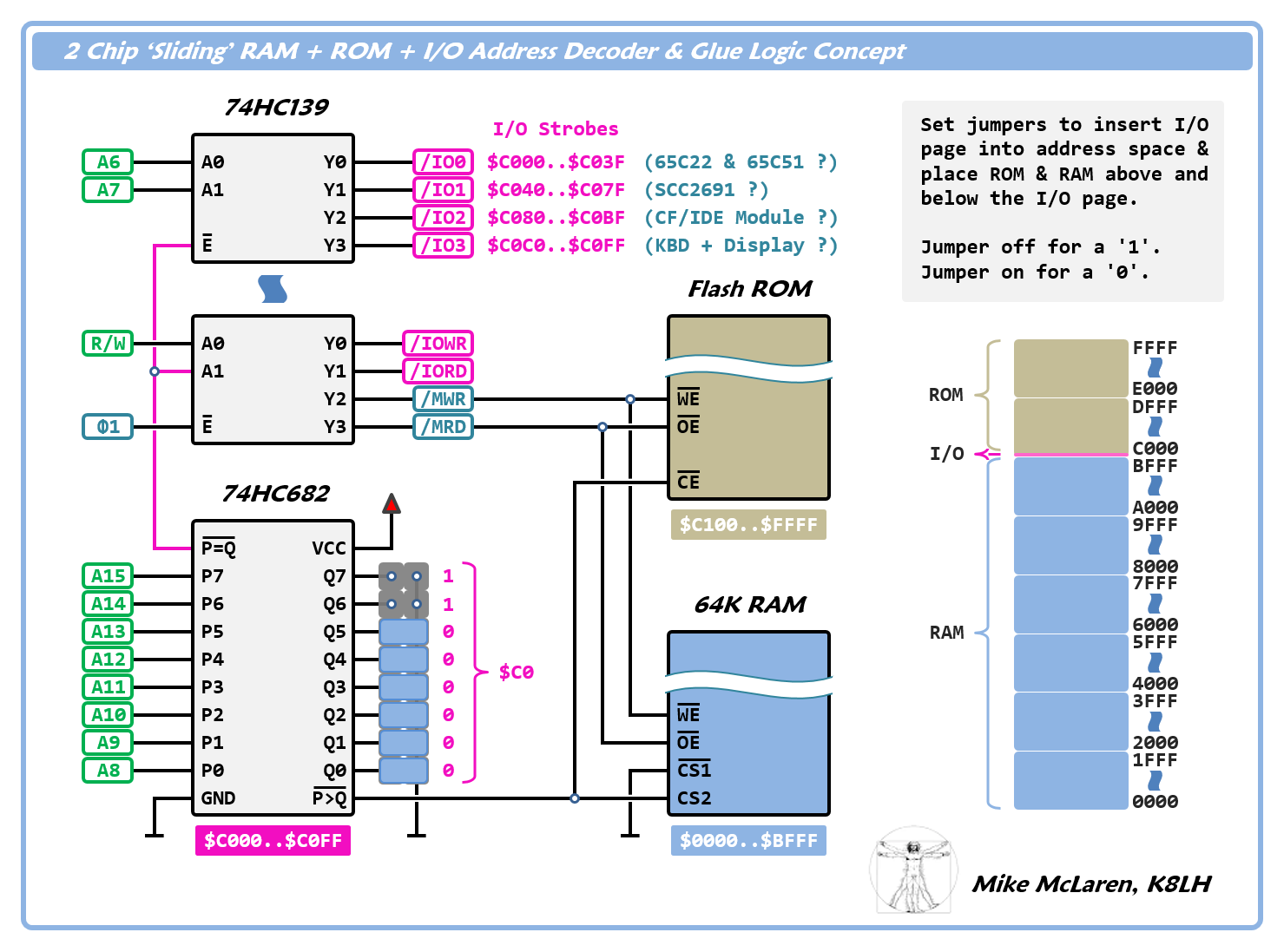 Just to be plain - My intended memory map is the 8k of ROM, a page of IO space at $DF00 (although I'll be putting in dip switches so I can configure that) and the remaining 56k as RAM.
