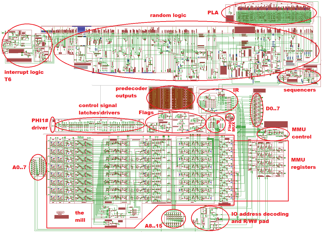 A picture of the 6509 silicon, with the interesting areas marked.