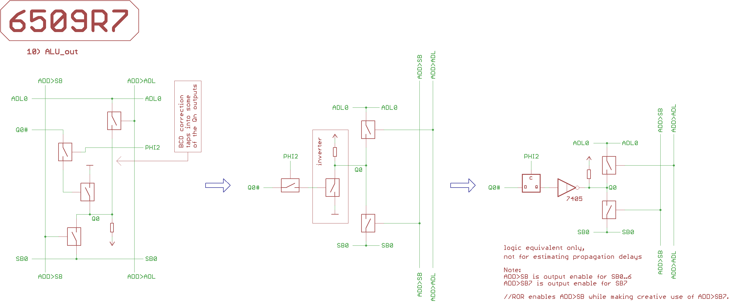 The low_active ALU result bus Q# is sampled by a latch during PHI2.