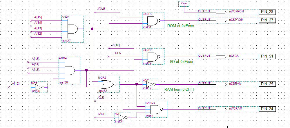 Enough of booting out of CPLD, today I will add RAM and EPROM to the board. Below is a simple decode logic for RAM, EPROM, and expansion I/O such that