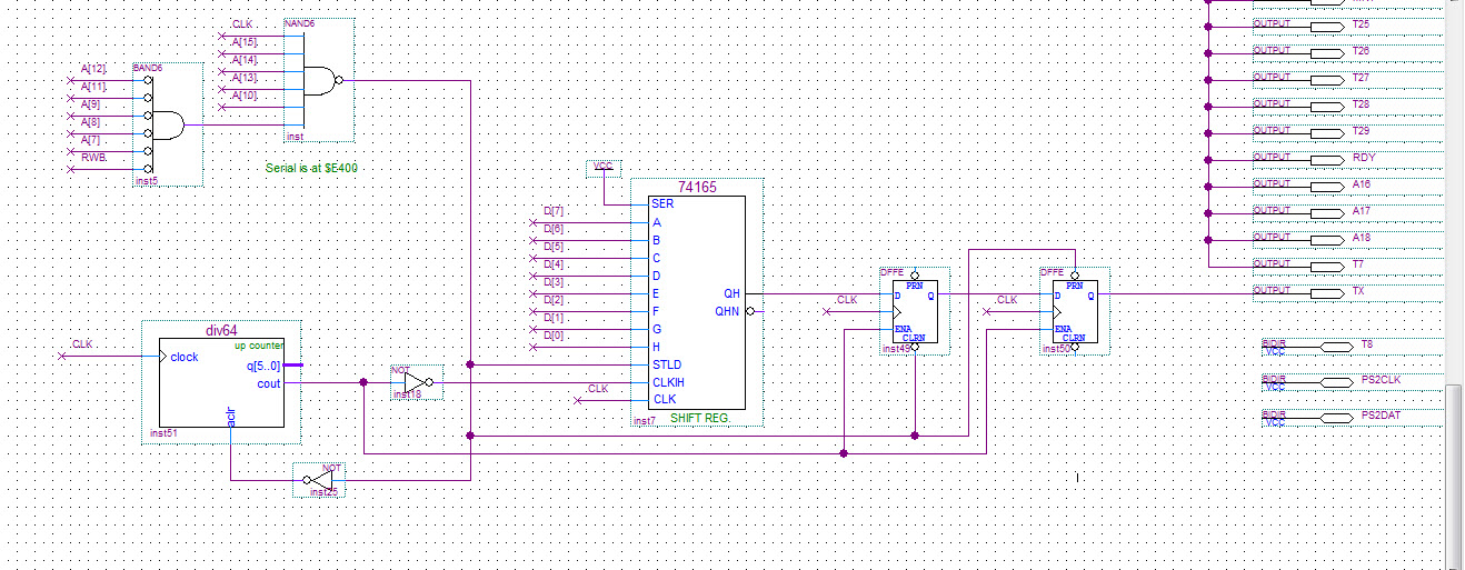 The serial transmitter is located at $E400. It is basically a TTL 74165 parallel-in serial-out shift register with few more logic to implement serial protocol's START bit circuitry. A divided-by-64 counter reduces the 7.37MHz system clock to 115200 baud. When "STA $E400" instruction writes to the serial port, the divided-by-64 counter is reset, 74165 is loaded with a byte of data, and the START bit register is reset to 0. Transmitter starts after the negation of the write.