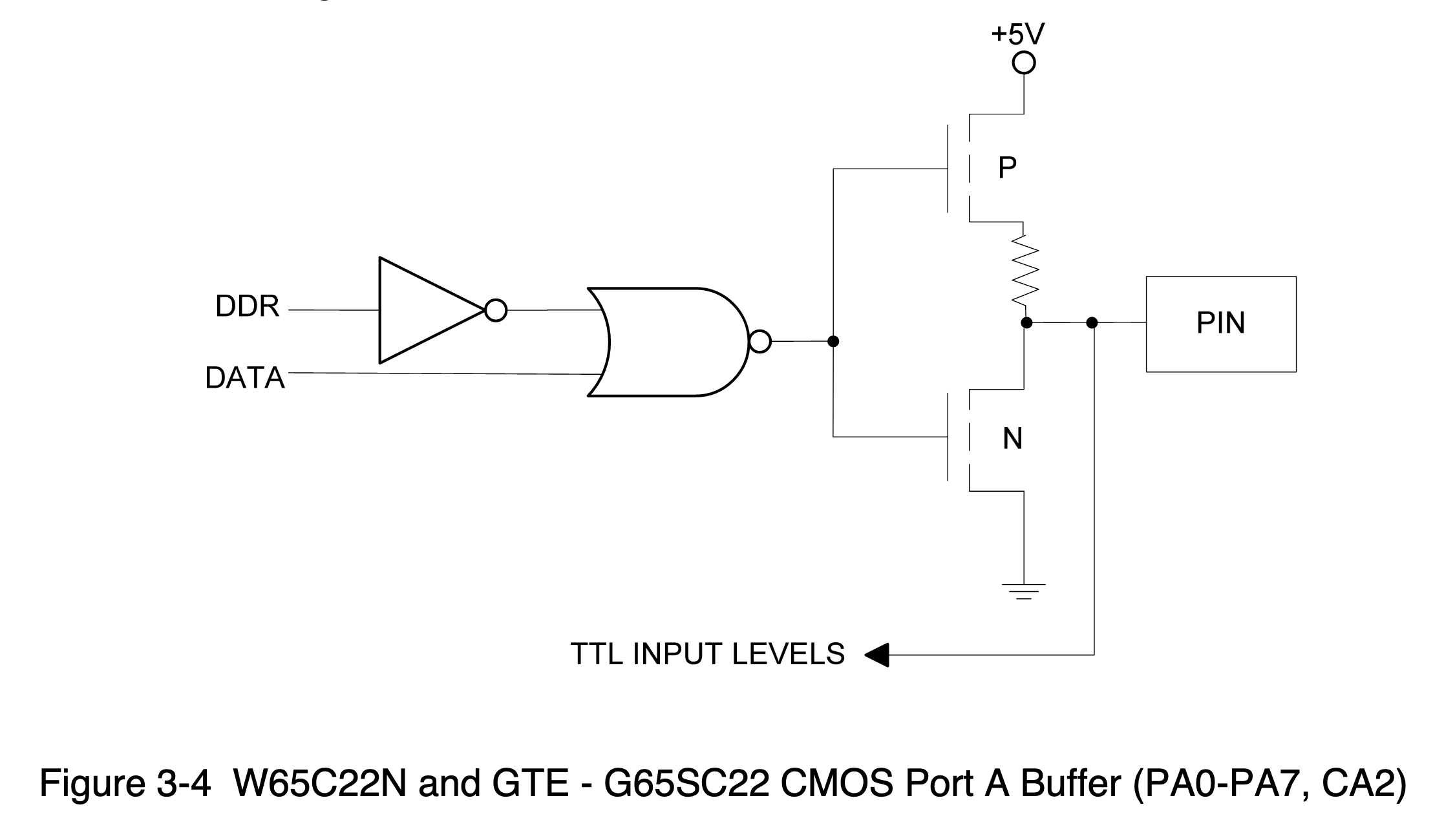 Now, I'm no expert (!), but my reading of the schematic is this. In input mode, DDR will be 0 (DATA doesn't matter). The inverter will turn this into a 1 and then the NOR gate will turn this into a 0. With the P-channel FET, this will cause the FET to be ON, because there is negative voltage at the Gate relative to the Source (which is at +5V). I know the resistor is a current-limiting one, but it feels to me like it would act as a pullup in this situation. (The N-channel FET will be off).