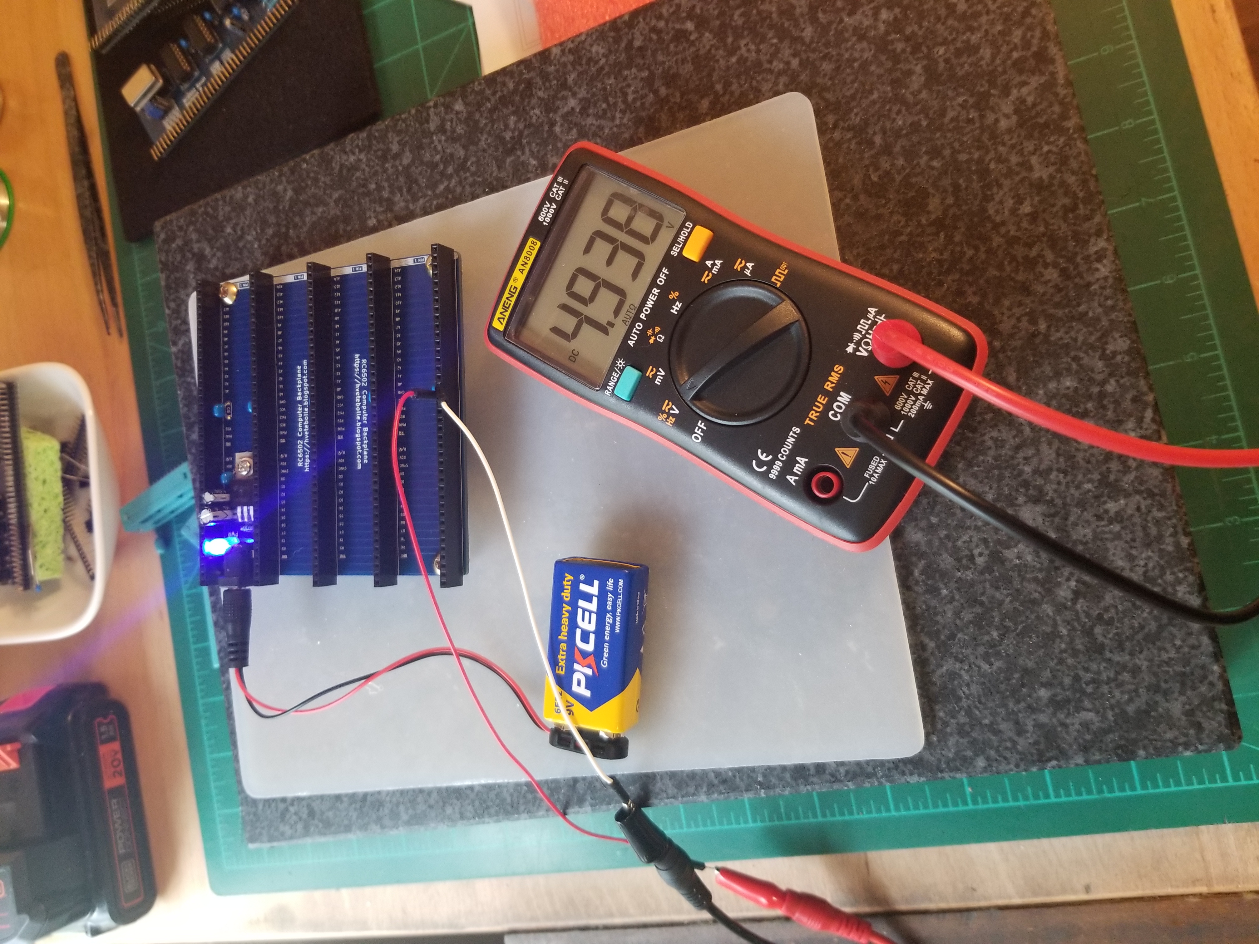 As far as I can tell with my little multimeter, everything is working out OK. The voltage regulator on the backplane seems to be working, the clock module is producing a steady 8Hmz. However, I have encountered a puzzlement. Here is my testing setup: