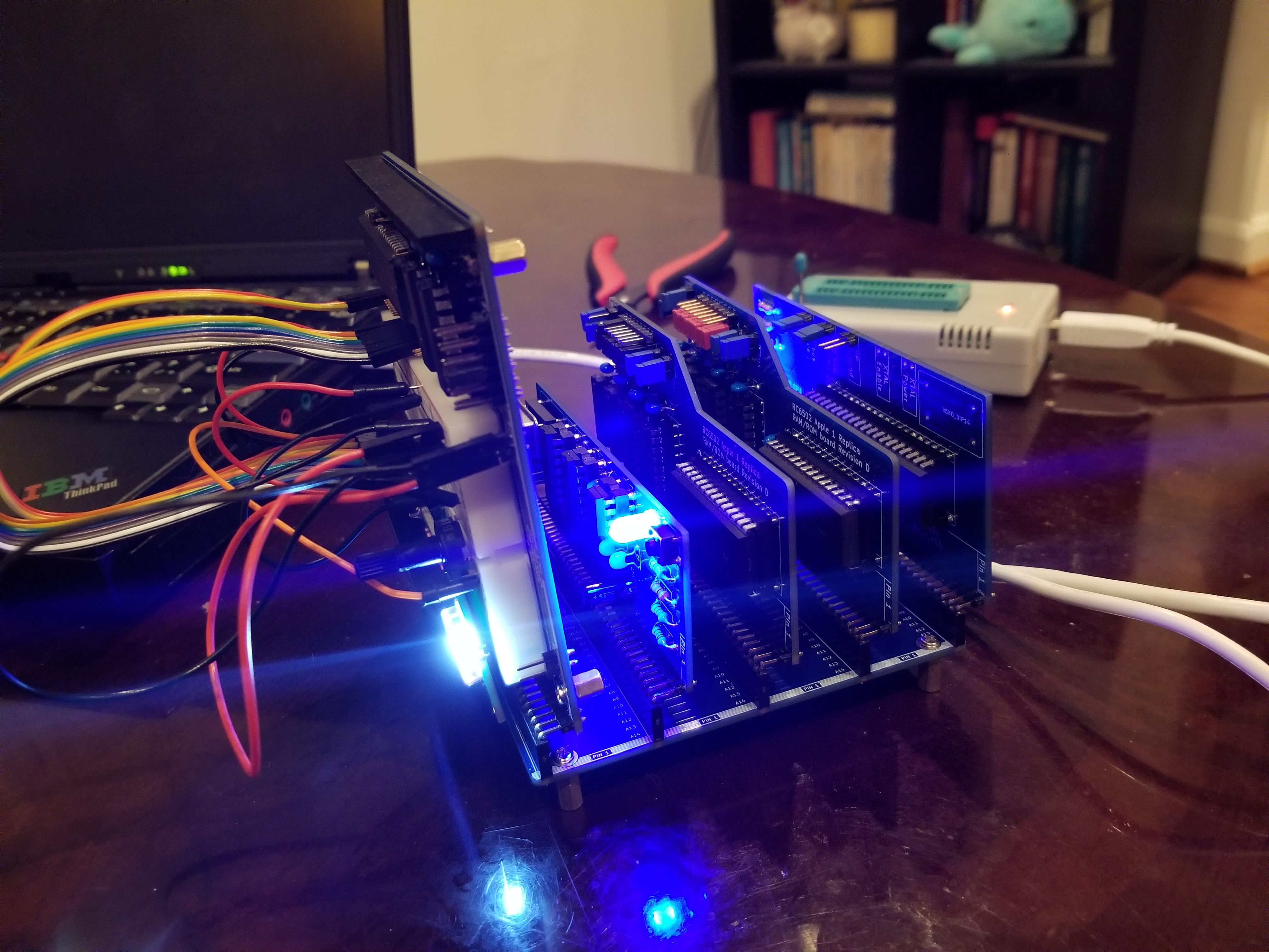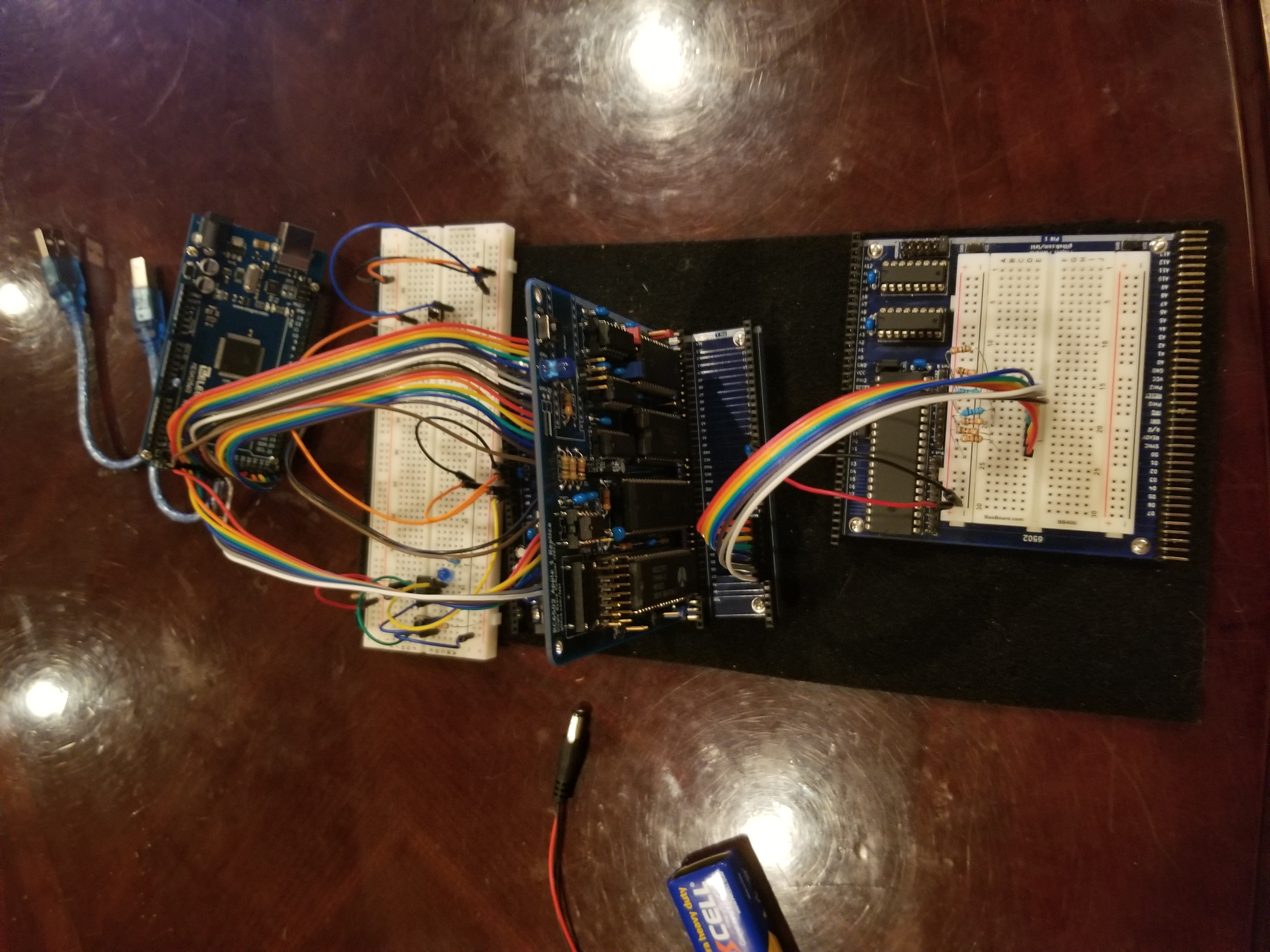 That's an Arduino running Ben Eater's 6502 bus monitor; on the left of the top (larger) breadboard is a single-step circuit; on the right is the reset button. The main event is the RC6502 SBC plugged into the RC6502 backplane. The SBC has RAM, ROM, and PIA disabled via jumpers; I didn't populate the clock (I'm using the single step circuit) and Arduino parts of the board. Even though there's an Arduino in this photo, I'm not really very interested in them, and I don't want to farm out all the most interesting parts of my computer (I.e., I/O) to a tiny but vastly more complex micro-controller. In the foreground is the RC6502 Project Board, which is not connected to anything; I'm just using its mini-breadboard to put out NOPS on the data bus.