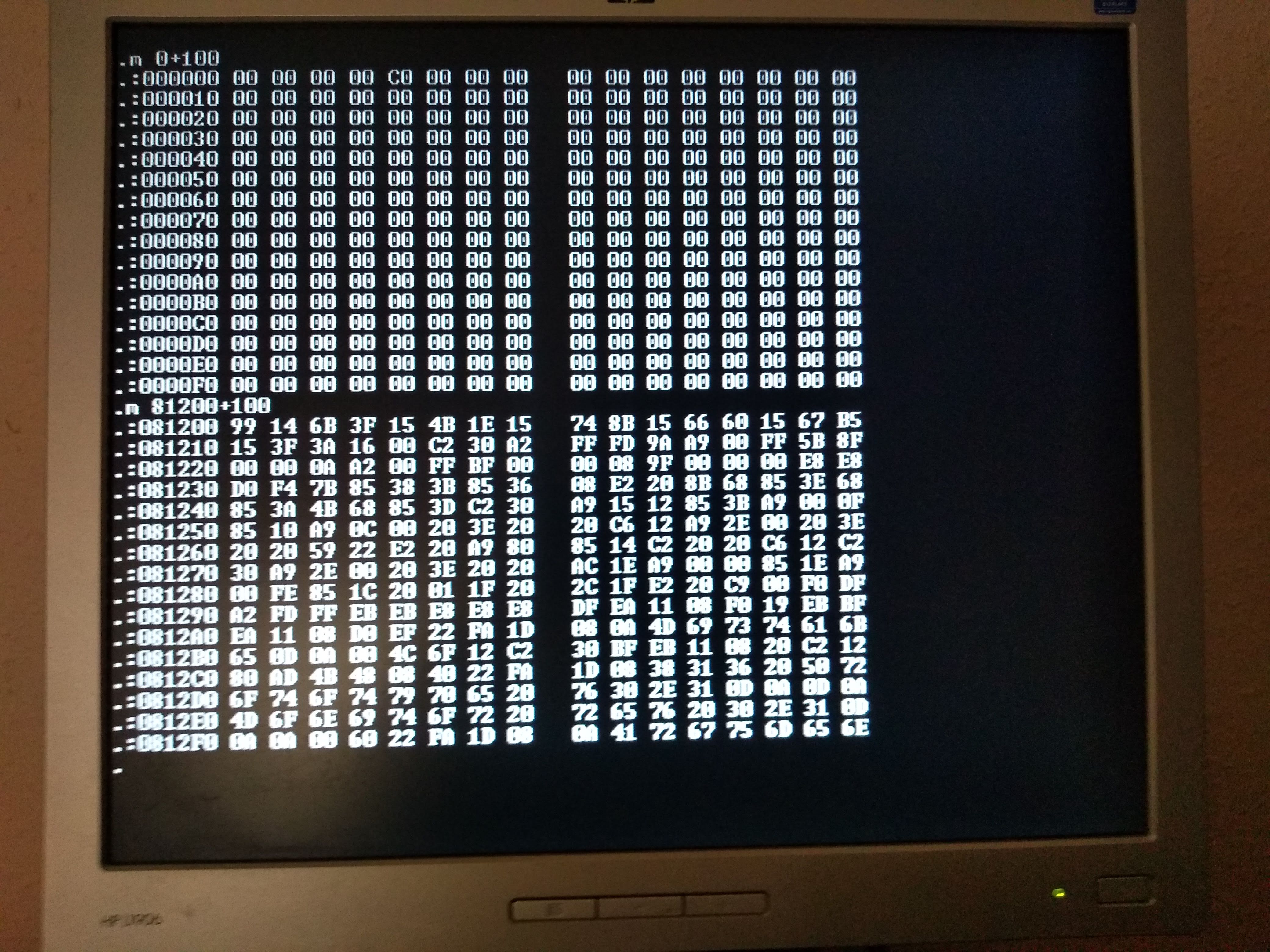 This is a memory dump from the system boot monitor on the video display: