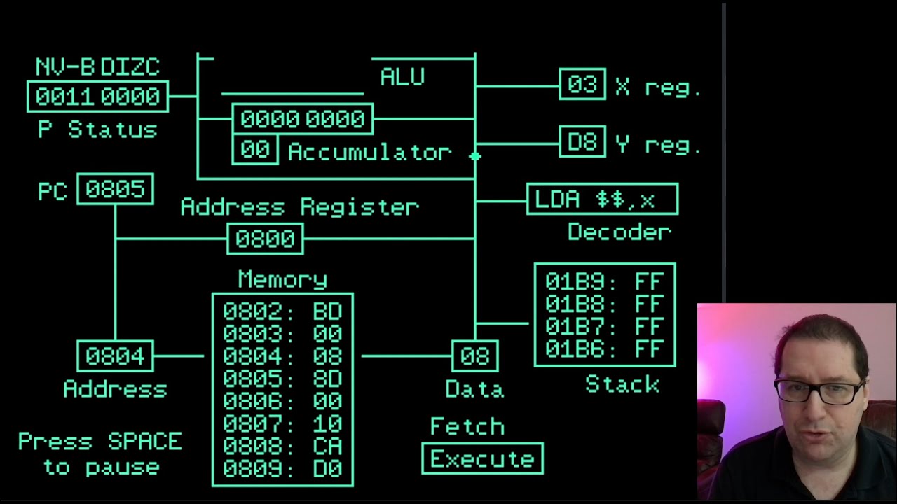 This looks nice, and might help someone somewhere understand about the 6502 and its instruction set. It purports to show internal operation of the 6502, but it's from 1982, and we now know rather more about how things work internally. It's nicely animated in Apple II high resolution graphics. I don't suppose it's cycle-accurate but it shows memory traffic byte by byte as well as internal register transfers and operations.
