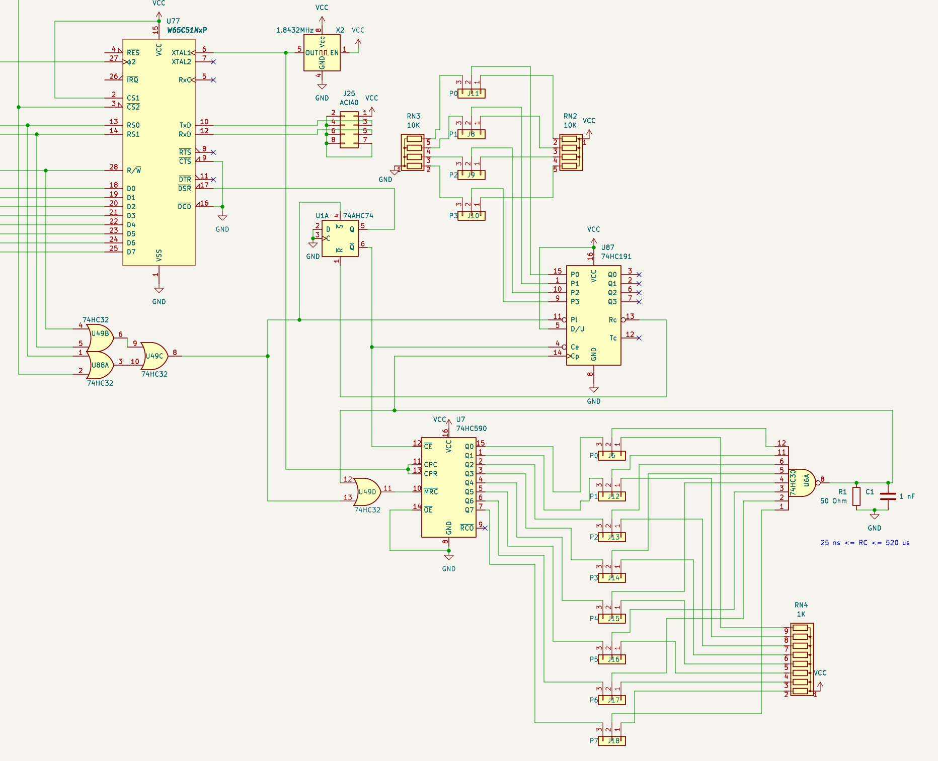 Also if you're feeling industrious in the future you could swap out the top jumpers for a '573 latch and make the bit count programmable by the 6502. If you're even more industrious you could swap out the bottom jumpers for another latch and the NAND gate U6A for a '521 comparator; feeding both the latch and the '590 counter into the comparator. You could alternatively swap out the '590 counter for two presettable latches and load them from a latch to make a programmable frequency divider.