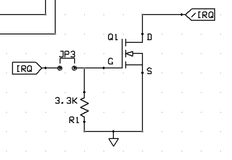 So what's happening here is that with the jumper open, or the jumper closed and the 16C550 INT output low, the voltage on the gate is the same as on the source, GND, and this being less than a 0.8V difference between the two means that the MOSFET does not conduct between the source and the drain (or the drain and anything else). Thus whatever the drain is connected to will be at whatever level it is, which is Vcc because you've got a pull-up (not shown in you schematic) on the 6502's /IRQ line.