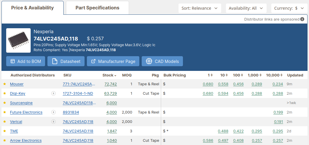 Here's an example of 74LVC245AD,118 with the list sorted by available stock: