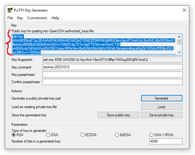 Back in puttygen copy the Public-Key text again, paste it into a text editor and save it somewhere useful with the .pub extension. E.g. C:\MyKeys\MyKeyName.pub Do not use the Save Public Key button from puttygen unless you know what you're doing. We're saving the OpenSSH Public-Key text just-in-case.