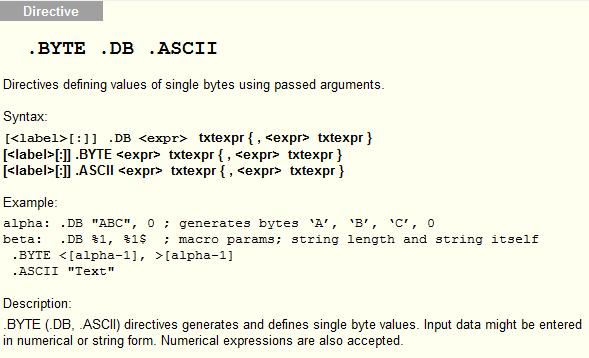 I use the interactive help Kowalski provides in the right pane. For example, if I cursor near a .BYTE directive in my source: