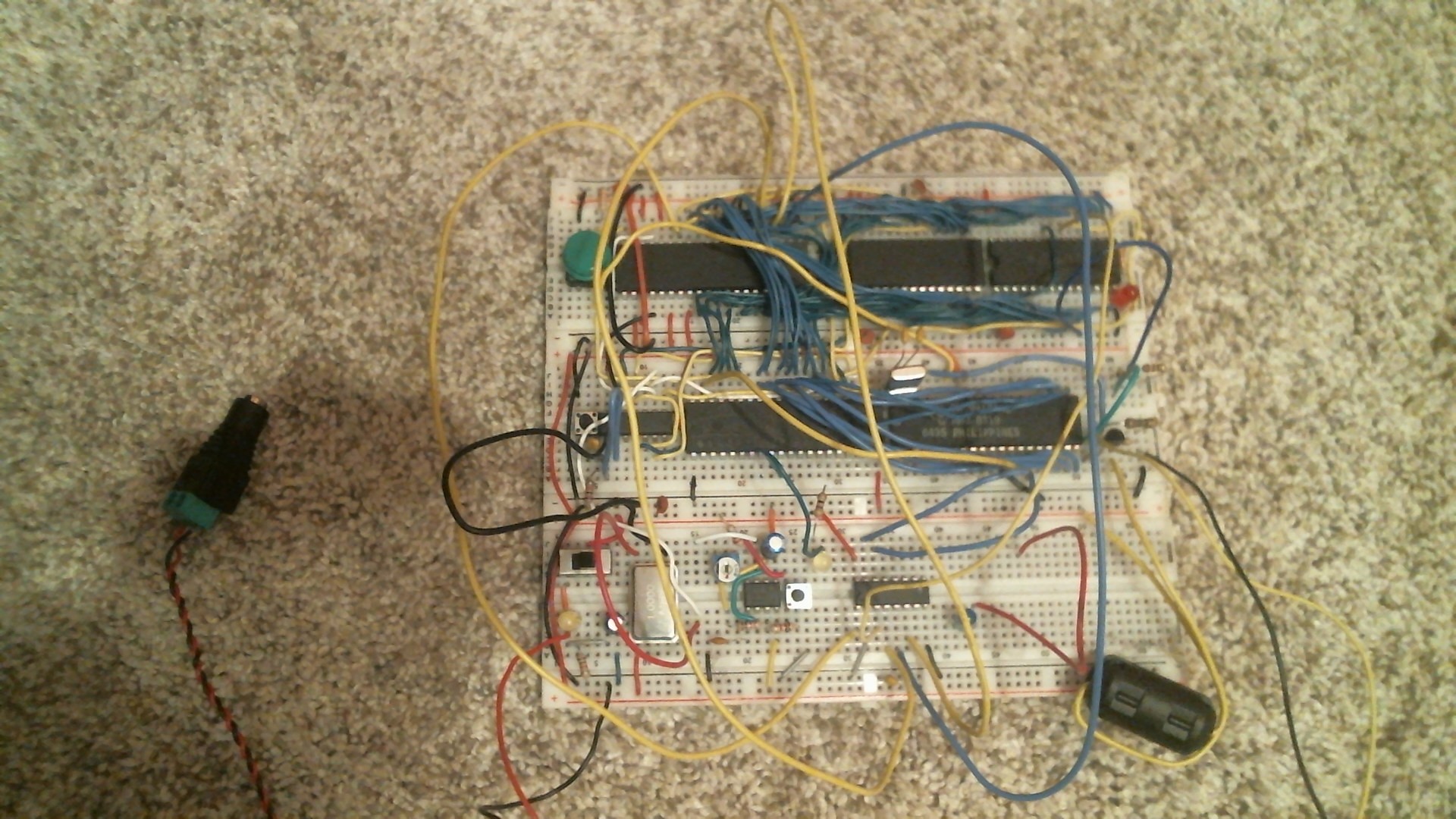 that is a little worrying - it's usual to use a clock can (crystal oscillator) not a bare crystal - I see such a flat metal rectangular four-pin device at the bottom left of the original breadboard. Is that the one you're talking about?