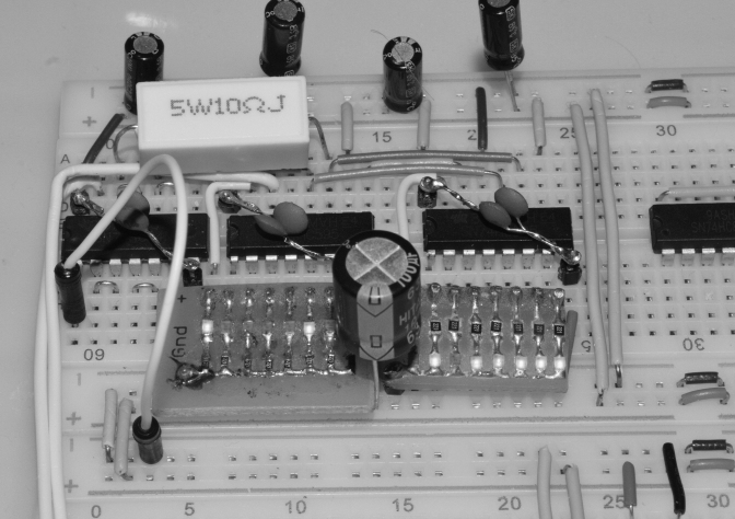 Picture in color, the culprit is on the top left - the red cable vs. the white wire Here it is in BW, it works with the CABLE (top left), Stop bit is clear. And when the cable is removed and the same holes are used for a wire, it fails and Stop bit is lit. (usually the second 8-leds are all on or all off, acording to the 8.Led on the left - which is bit 6) And here is the same picture, with wiring enhanced (some wire are not (good)visible in the photo) ----