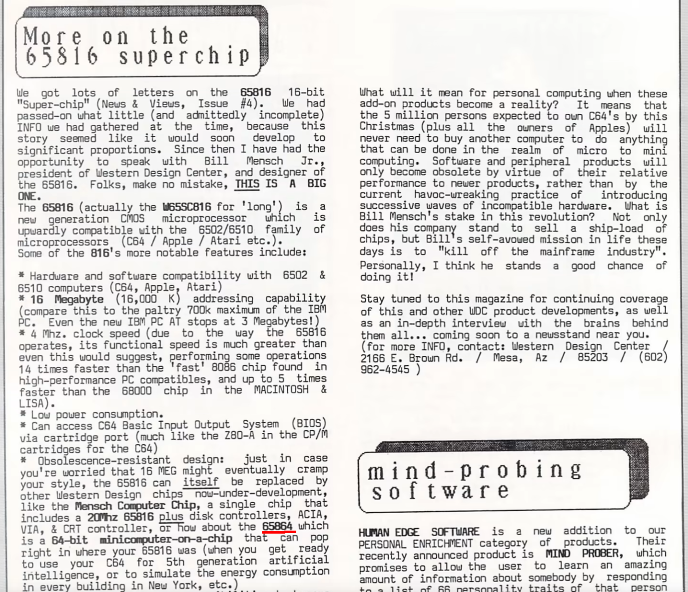 * Obsolescence-resistant design: just in case you're worried that 16 MEG might eventually cramp your style, the 65816 can itself be replaced by other Western Design chips now-under-development, like the Mensch Computer Chip, a single chip that includes a 20Mhz 65816 plus disk controllers, ACIA, VIA, & CRT controller, or how about the 65864 which is a 64-bit minicomputer-on-a-chip that can pop right in where your 65816 was (when you get ready to use your C64 for 5th generation artificial intelligence, or to simulate the energy consumption in every building in New York, etc.)