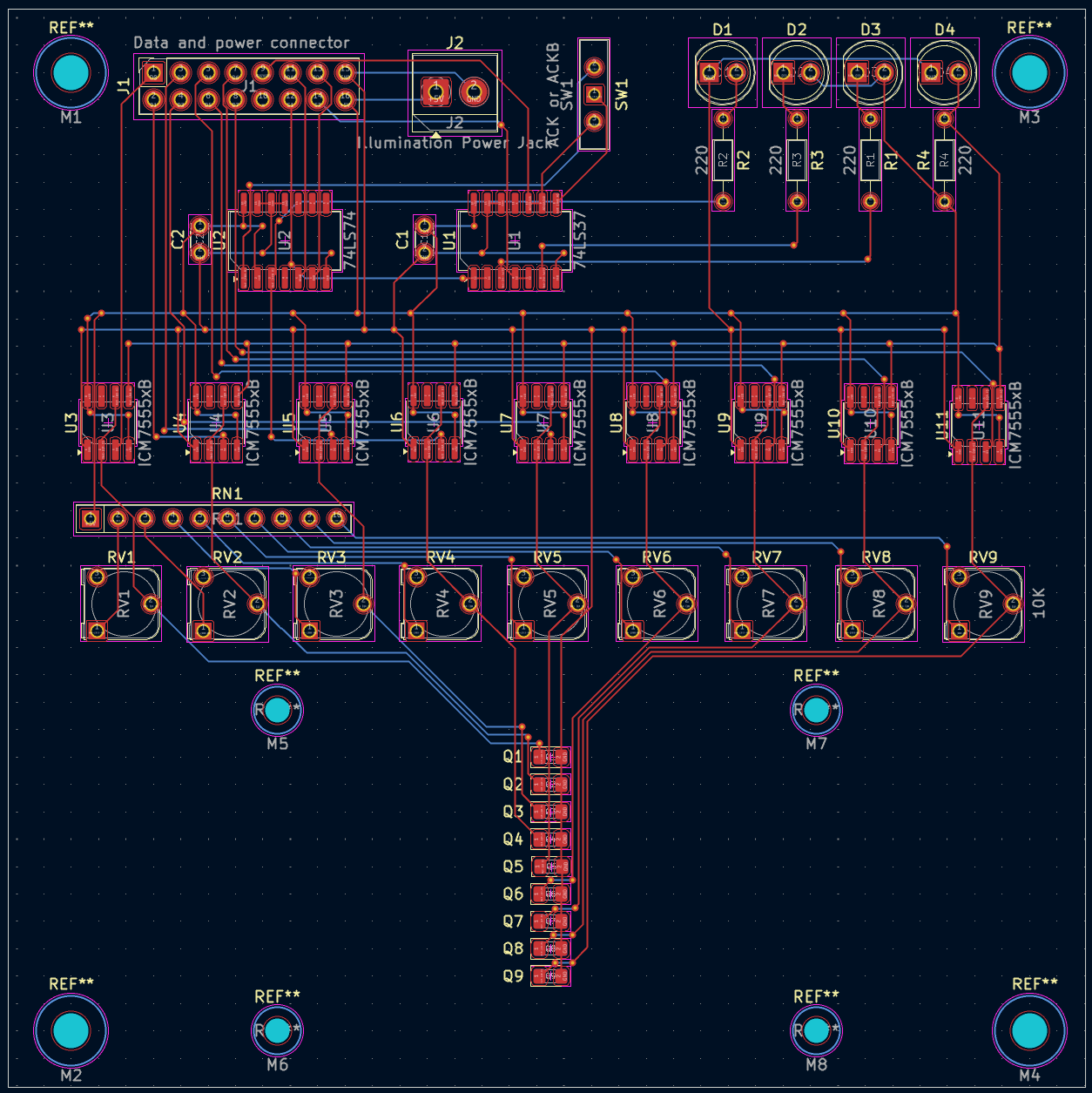 My first step was reading through the OP-80a's schematics and documentation available online, reproducing the schematic in KiCad, and then doing a board layout. That way I understood how it works. Essentially it uses phototransistors to sense the tape holes, nine 555 timers configured as Schmitt triggers, with pin 5 supplying the reference voltage via an LED and 220-ohm resistor voltage divider. Eight of the phototransistors are for data lines with the ninth using the sprocket hole as the clock pulse.