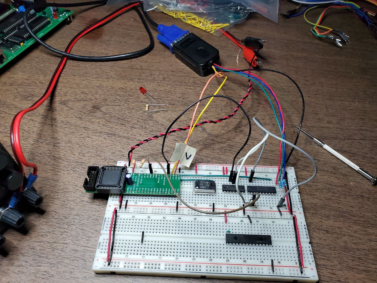 Been trying to get VGA working...a ATF1502 generating the horizontal and vertical counts and sync pulses...I suspect right now the OE# of my 74HC574 is slightly off from the blanking signals causing the monitor to see some output from the picture before the '574 releases the circuit.
